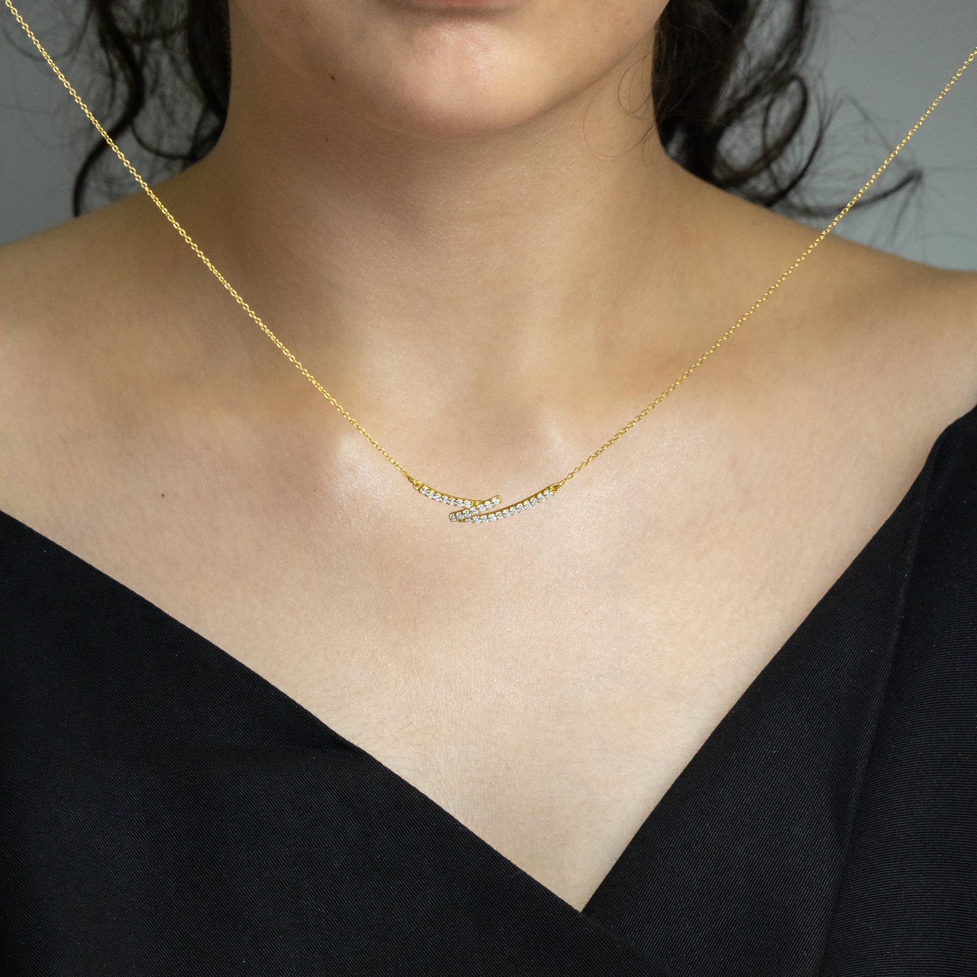Embrace contemporary elegance with our exquisite 'Dynamic Duet' Bar Necklace. Featuring two gracefully curved, sparkling bars intertwined, this piece adds a modern touch of refined style to your everyday.